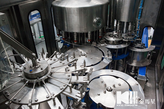 飲用水灌裝機(jī)集沖洗、灌裝、旋蓋于一體,全過程自動化運行,主要適用礦泉水、純凈水等不含氣飲料的沖瓶、灌裝、封口連續(xù)作業(yè)。本機(jī)大部分電器系統(tǒng)零件均采用國外優(yōu)良產(chǎn)品,所有與液料接觸的地方均采用優(yōu)質(zhì)的不銹鋼材料制作,主關(guān)鍵部件采用數(shù)控機(jī)床精密加工, 整機(jī)光電檢測各部件的運行狀況,無瓶不灌裝,無瓶不送蓋,自動化程度高,操作簡易,具有耐磨、穩(wěn)定、故障率低等特點,產(chǎn)品質(zhì)量處于行業(yè)前列,是新老飲料投資者的選擇。